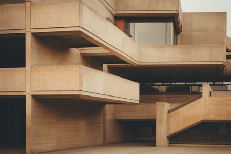 brutalist building at dusk, showcasing its raw concrete structure, geometric shapes and starkness of brutalist architecture.