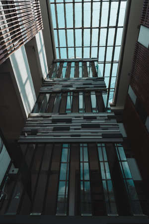 underside panoramic and perspective view to steel blue glass high rise building skyscrapers, business concept of successful industrial architecture