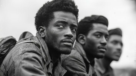 Black-and-white image of determined soldiers depicting unity, courage, and historical presence. The serious expressions and vintage style suggest themes of solidarity, resilience, and a meaningful moment in history.
