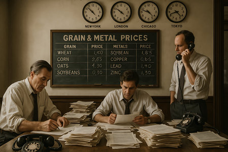 Three serious businessmen diligently work in a vintage-style office, reminiscent of a mid-20th century trading floor. One man speaks on a rotary telephone, while two others meticulously review documents at a desk overflowing with paperwork. In the background, a chalkboard displays 'Grain & Metal Prices' and clocks show times for New York, London, Chicago, and Tokyo, highlighting the global nature of their financial operations.