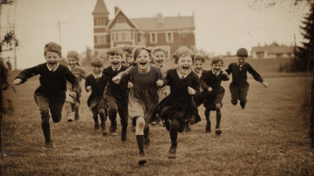 A group of children running and laughing outdoors in a vintage style photograph. Sepia toned image.