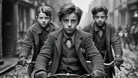 Old black and white photo of Old Amsterdam, boys riding bicycles down the street. Nostalgic scenes, industrial city scenes, working class scenes