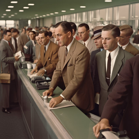 A full shot of a busy mid-century office, where several dedicated workers, both men and women, are diligently engaged in their tasks. They are seen using vintage calculating machines and typewriters at wooden desks, surrounded by stacks of paperwork, ledgers, and classic rotary phones, evoking an authentic 1950s or 1960s corporate environment focused on manual data processing and administration.