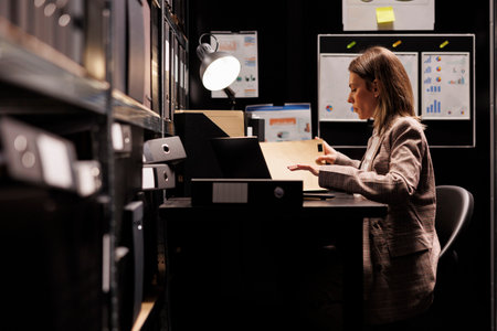 Caucasian policewoman entering office space with documents, evidence, and files setting up for research and observation. Female private investigator expertly analyzes confidential records on laptop.