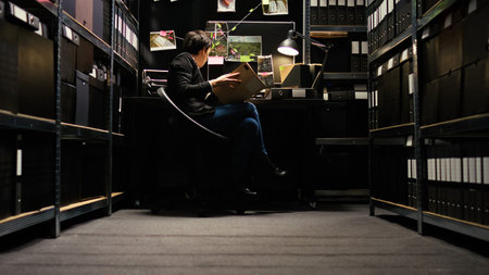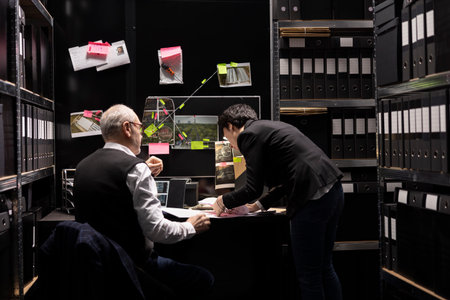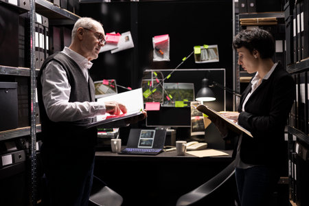 Private investigators sorting classified case files and collecting information in order to solve a criminal illegal operation. Coworkers connecting evidence for a secret police mission.