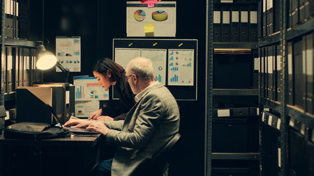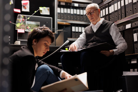 Overworked police officers analyzing criminology report, working late at night at federal criminal investigation in arhive room. Private detectives checking federal files, discussing crime evidence