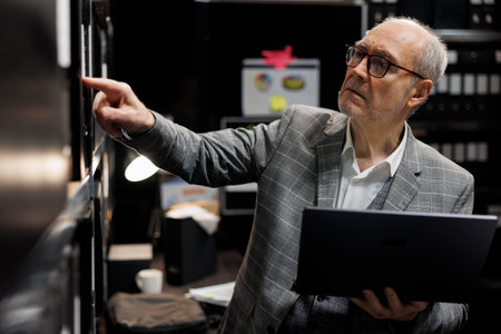 Senior private detective in criminal cases archive room looking for criminal case file details on cabinet shelves. Elderly investigator surrounded by criminology folders in agency depository office