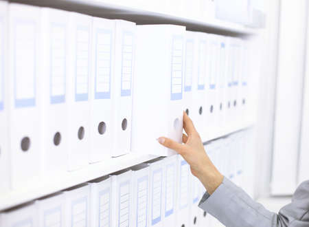 Female hand holding a binder of documents on the row of file folders that nicely management system on the office's shelves.