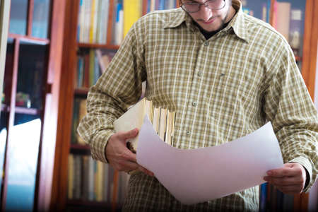Search for information in the database. A man holds a paper card with information. Wooden cupboard in an office or library. Secret documents