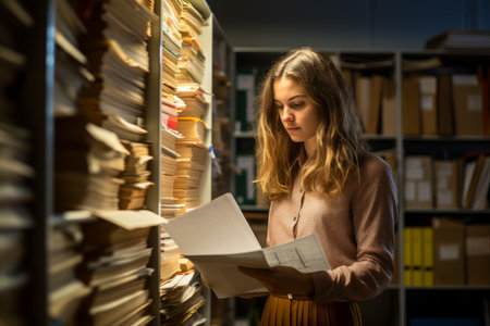 Manager organizing corporate depository, analyzing accountancy report checking administrative record. Businesswoman reading bookkeeping documents, working late at night in storage room