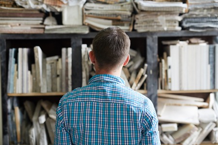 Man bowed head between bookshelves. Student with beard tries remember all knowledge with help of power of mind