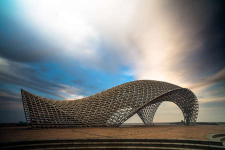 The Light and Shadow Nautilus art structure outside The Ring Shopping Mall in Chongqing, China. It is a large, spiraling metal structure designed to resemble a nautilus shell