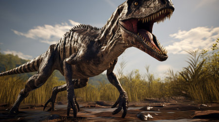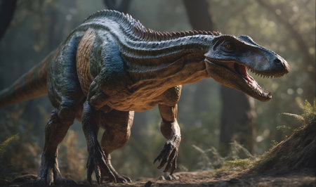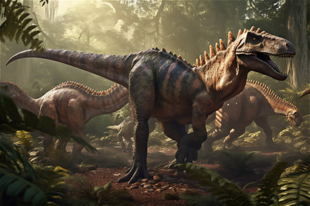 AI-generated majestic dinosaurs in a prehistoric landscape. Raptor. Vivid colors and intricate details bring these ancient creatures to life. Perfect for educational materials, scientific publications, and digital art. The concept of time when dinosaurs ruled the Earth.