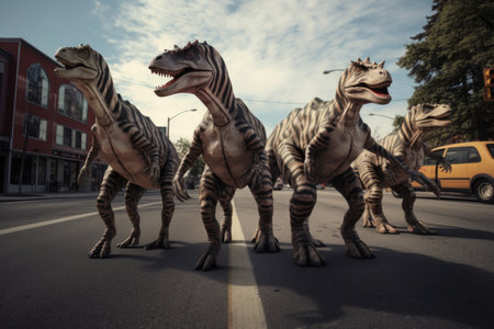 A group of fake dinosaurs walking down a street. Imaginary illustration.