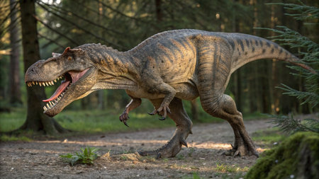 A large, predatory dinosaur stands in a dense forest