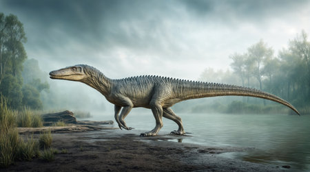 Baryonyx dinosaur walking through a shallow river in a dense prehistoric forest with ferns, trees, and misty surroundings, showcasing its aquatic nature and ancient habitat, ideal for science and educational use.