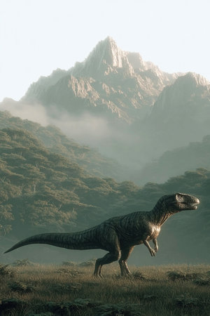 An Afrovenator wanders through a lush prehistoric landscape surrounded by dense forests and towering mountains capturing the ancient Earth's vibrant ecosystem and majestic scenery.