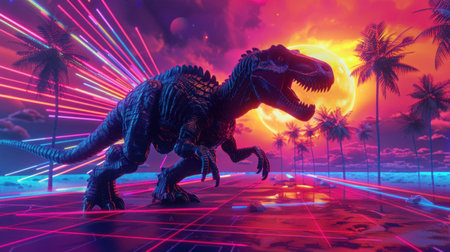 A futuristic dinosaur stands on a neon grid under a vibrant sunset with palm trees, showcasing a blend of retro and sci fi aesthetics