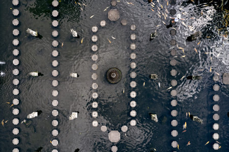 An aerial view presents a serene garden pond setting, featuring koi fish swimming amidst circular planters overflowing with foliage. Wooden pathways gracefully arc over the water, which reflects natural light. The composition evokes a sense of tranquility. Ideal for commercial applications related to landscape design, relaxation, and nature.