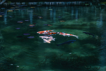 A picturesque scene unfolds as koi fish glide through a clear pond. The vibrant orange, white, and black colors create a tranquil and eye-catching underwater dance amidst the gentle ripples.
