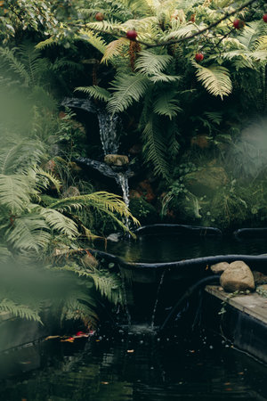 Beautiful tropical garden with pond and waterfall in the rainforest.