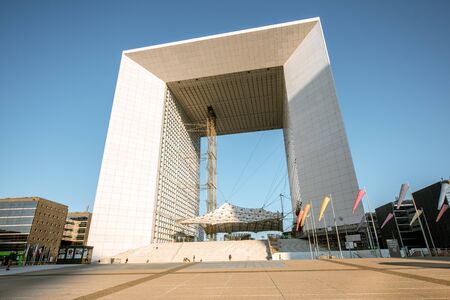 PARIS, FRANCE - September 02, 2018: View on the famous Grand Arch, the monument and building in the business district of La Defense during the morning light in Paris