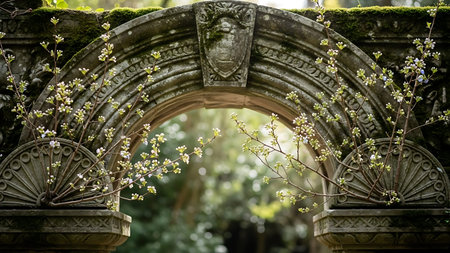 An ornate, vine-covered stone archway featuring intricate carvings, symbolizing ramadhan, a sacred islamic period, in a tranquil garden setting
