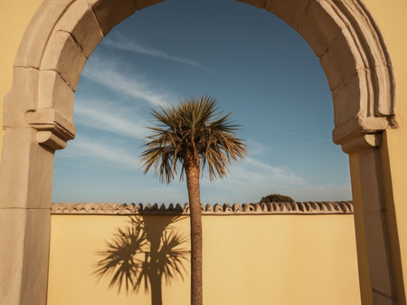AI Generated. A Palm Tree Casts Its Shadow on a Yellow Wall with an Archway