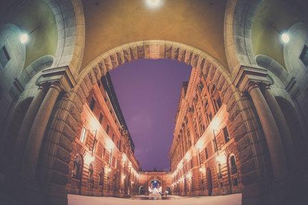 Viennese city gate with orange light in the back and cobblestone in the front. Macro shot on the cobblestone. night photography