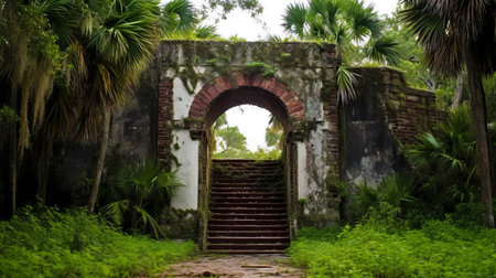A cinematic wide shot (16:9) of a large, decorative limestone archway situated in an overgrown histo