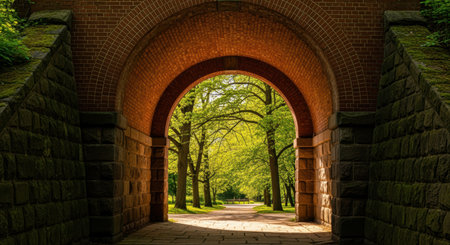 Sunlight streaming through a brick archway leading into a lush green park with tall trees and paved stone path in spring.