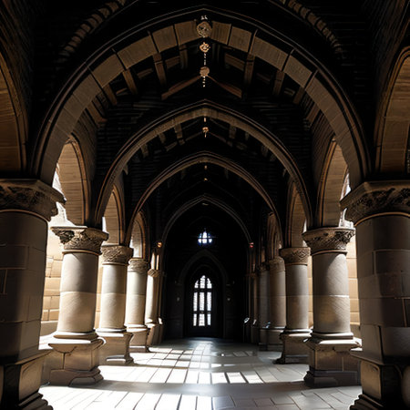 Gothic archway interior features intricate stonework and lighting, highlighting historical architecture and structure within a classic building.
