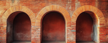 Red brick arches on an old wall, architectural detail. Historic building and design concept