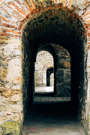 Stone arch at the entrance to the old stone church. Background with selective focus and copy space for text. Classic vintage architecture