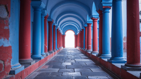 Red and blue columns create a captivating colonnade, leading towards a bright, ethereal light at the end of a stone pathway. Ai generated image