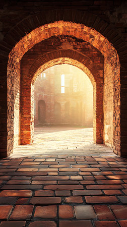 Sunlight brightly filters through a rustic brick archway, casting light onto the aged brick structure and the tile flooring of this ancient interior.