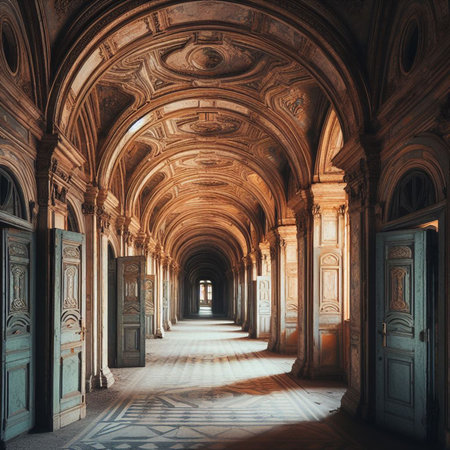 Bright and warm arcade, perfectly symmetrical construction in a fantasy corridor. Ai generated.