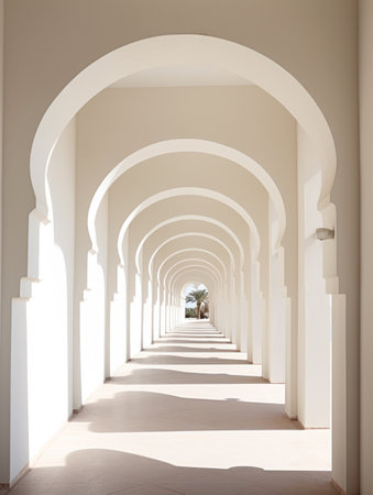 Curved arches create a harmonious flow in a minimalist interior, bathed in soft natural light, highlighting the elegant architectural features.