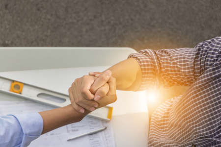 Top view of construction engineer team and business man shaking hands after meeting at construction site with blurred plan and tools background, success teamwork concept.