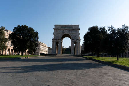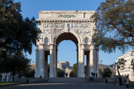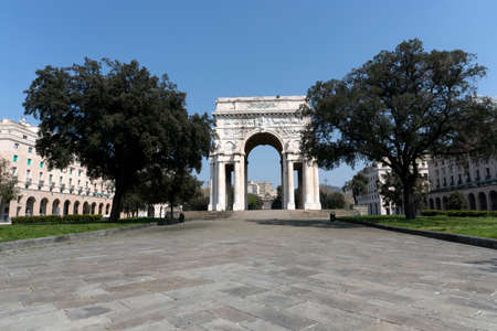 Genova, Italy - March 29 2019: The Arco della Vittoria (Victory Arch), also known as Monumento ai Caduti or Arco dei Caduti (Arch of the Fallen), is a memorial arch located in Piazza della Vittoria.