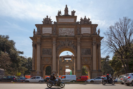 Florence, Italy - April 01 2019: The Triumphal Arch of the Lorraine is an 18th-century, monumental triumphal arch, located in Piazza della Libertà .