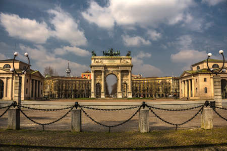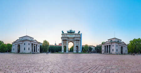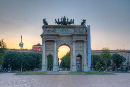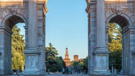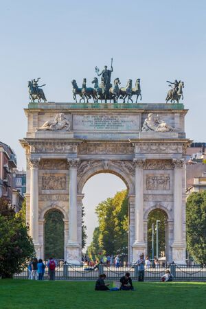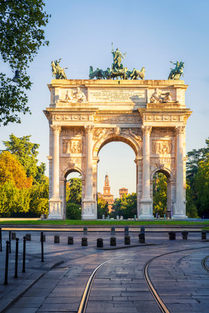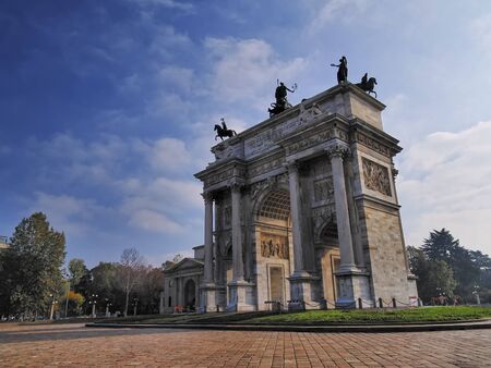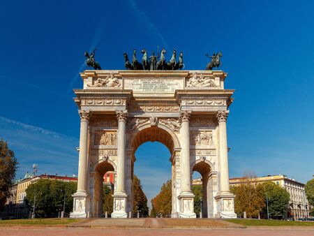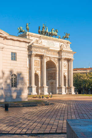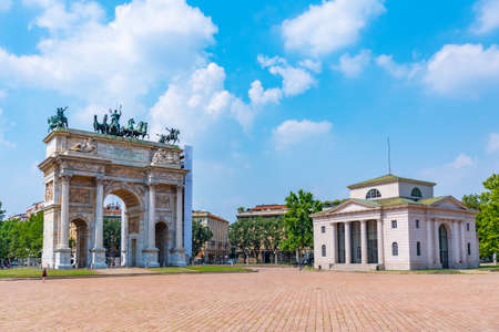 Arch of Peace or Arco della Pace, city gate in the center of the old town of Milan in the sunny day, Lombardy, Italy.