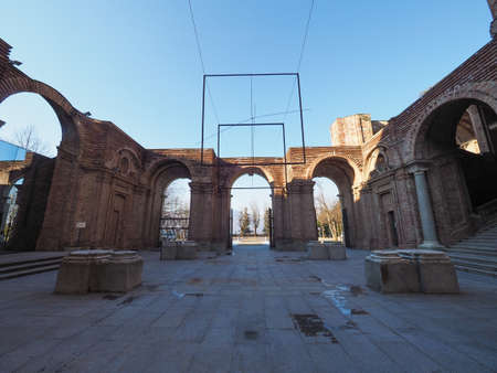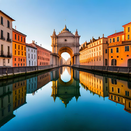 Milan, Italy 08.08.2020: Arches of Ancient Porta Nuova on Alessandro Manzoni street. Porta Nuova is one of the two medieval gates of Milan that still exist in the modern city.