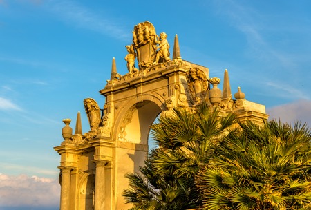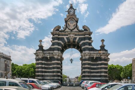 CATANIA, Sicily, ITALY - JUL 25, 2016: The arch Giuseppe Garibaldi (was built to honor the Spanish King Ferdinand I.) of Catania , is a triumphal arch built in 1768