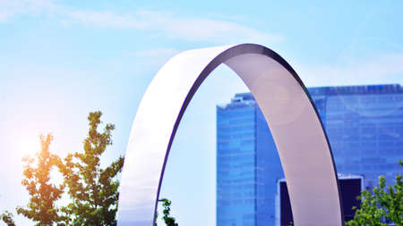 White arch with blue sky background. Abstract architectural background. Copy space.