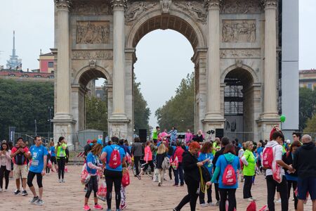 MILAN, ITALY - OCTOBER 13 2019: Athletes celebrate the end of the Deejay Ten at the Arco della Pace, a running event organized by Deejay Radio for the city of Milan.