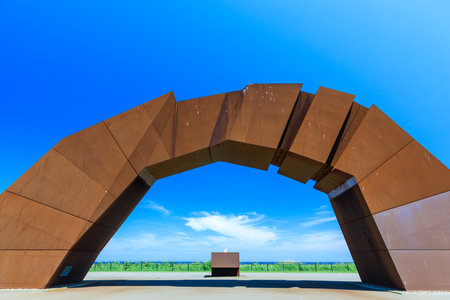 Arches on the seashore, retro monument in Sochi, Russia. Beautiful sea view before sunset, minimalistic landscape