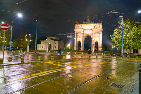 MILAN, ITALY - CIRCA NOVEMBER, 2017: Porta Sempione in Milan at night. Porta Sempione is a city gate of Milan, Italy.