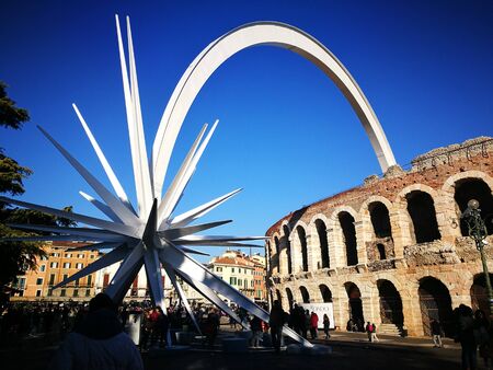 VERONA, ITALY - DECEMBER 27 2016- Tourists stroll near the Arco dei Gavi which is located in the square of Castelvecchio