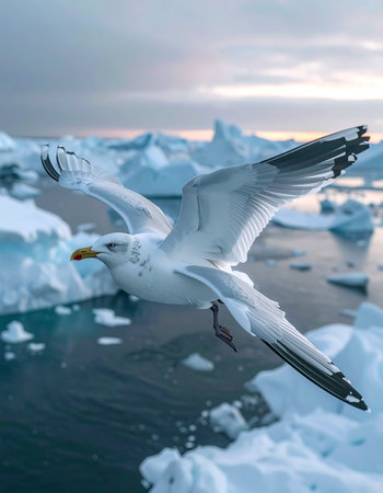 A majestic seagull glides effortlessly through the frigid air, its powerful wings spread wide against a breathtaking backdrop of massive icebergs in the Arctic Ocean.